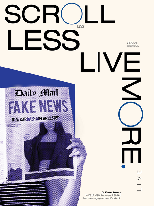 The posters have a collage style, featuring bold blocks of color paired with halftone images and common digital imagery. Each subject is matched with a cautionary fact placed on the poster, emphasizing the potential harm of too much screen time. These design details help reinforce the message. Each poster follows a similar grid structure to maintain consistency across the series. The slogan "Scroll Less, Live More" is meant to draw viewers in. To really get the full understanding of the message, viewers must come closer to the poster and engage with it for longer.